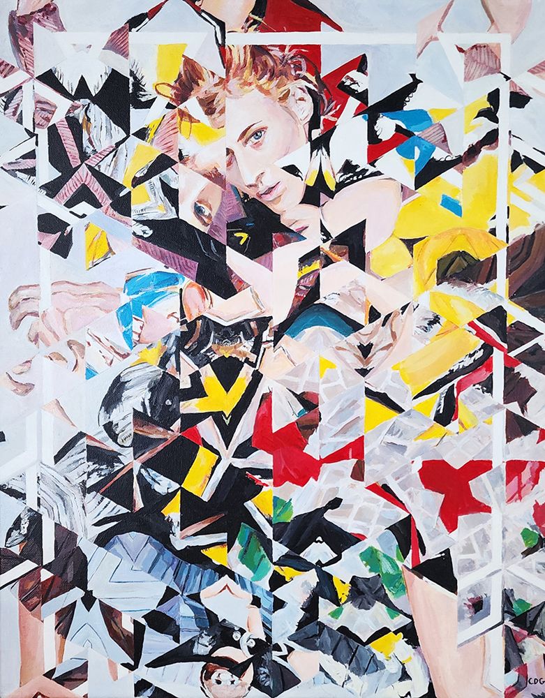 This piece started out as a magazine ad for a clothing brand, but the bright print and textures were just begging to be triangularized. I love the chaotic energy of the painting, a face and a hint of a hand peeking out of an abstract tangle of colors.